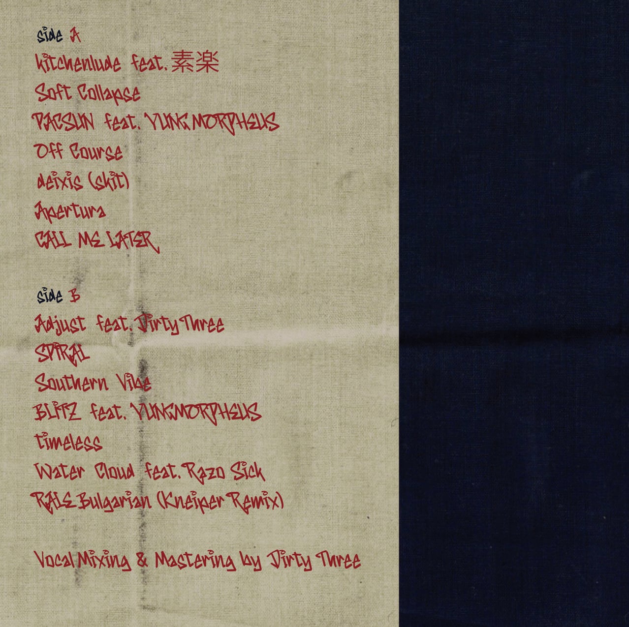 Leaving RecordsやLEXなどからのリリースでも知られるLAアンダーグラウンドの才人YUNGMORPHEUS 、メリーランドのラッパーDexter Fizzとのコラボ7inchでも話題を集めたDIRTY THREEや、盟友Razo Sick a.k.a 素楽などローカルの才能もゲストfeat。